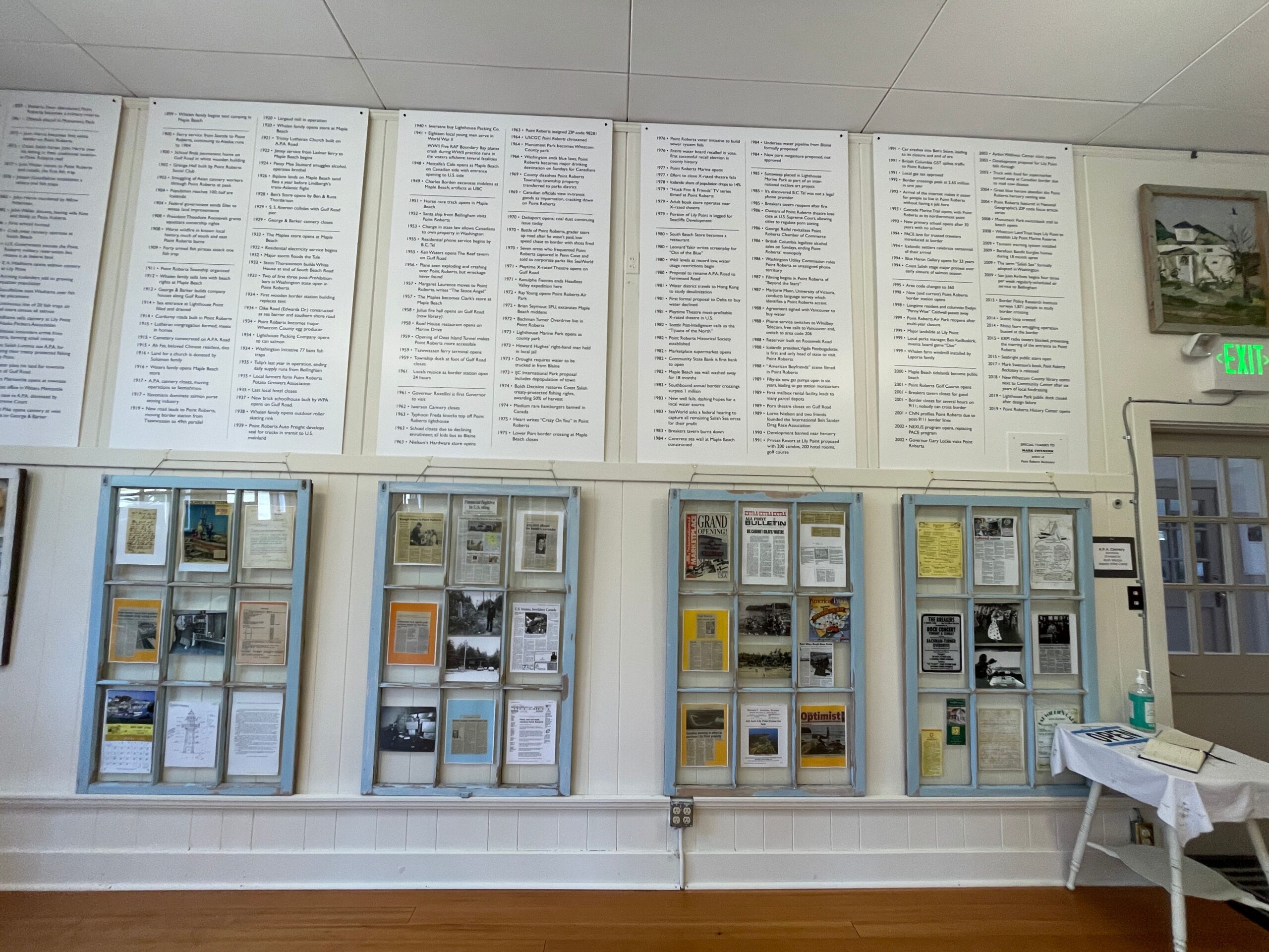 “One of my favorite exhibits is the timeline. Quite often we’ll say to visitors, ‘what year were you born?’ and then we can see what happened. Another is the windows [that display historic news clippings about Point Roberts]. We had heard when we were putting all this together that there were windows available from the Baptist Bible Camp across the street, so we wound up getting these windows. It turns out that they came from an APA cannery at Lily Point by barge in the 1940s!”
