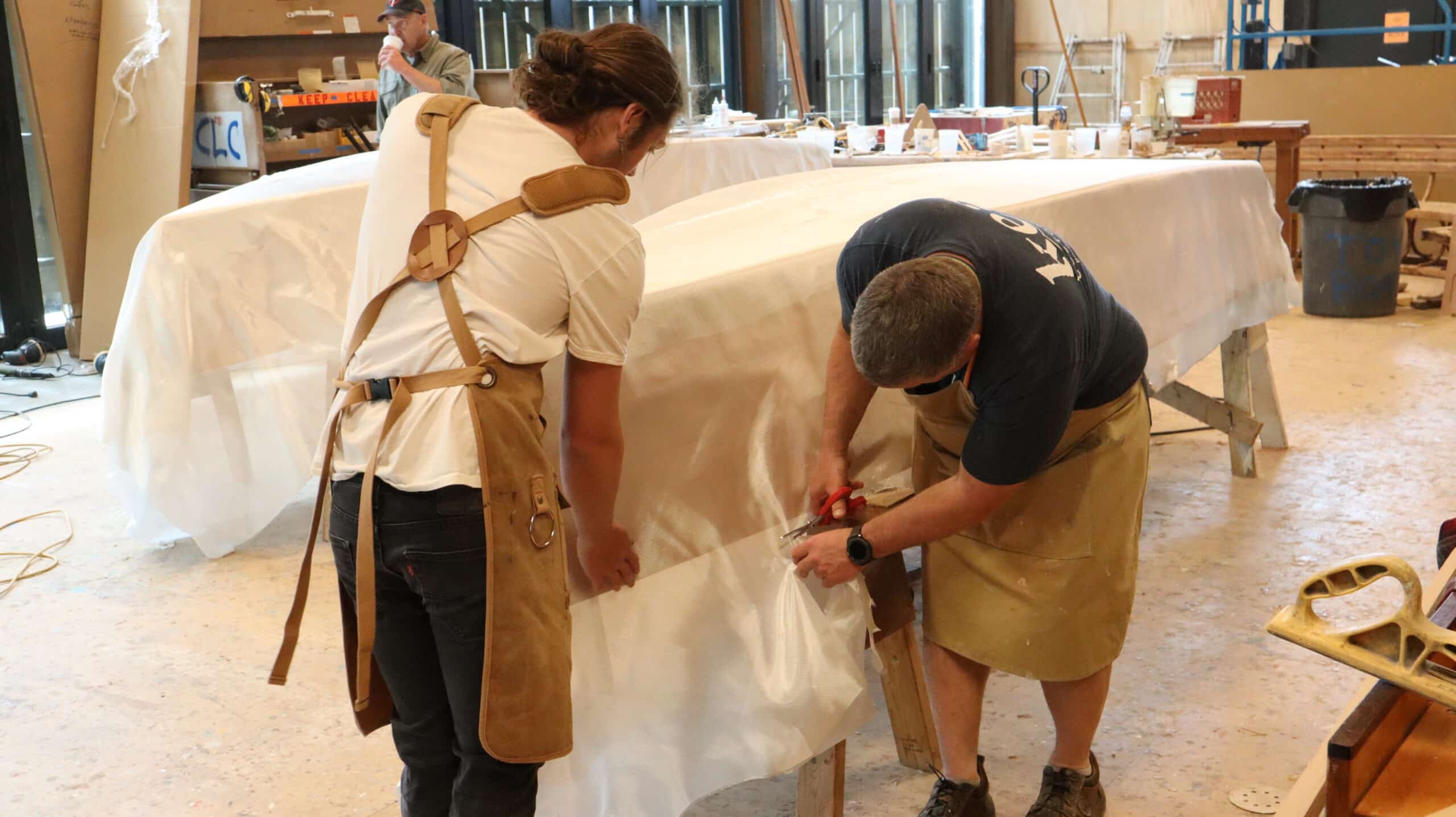 Back at the Wagner Education Center, a large garage-style door rolls up beside the front door, revealing several volunteers draping cloth over the hulls of two boats to coat them in fiberglass. In this space, workers have the resources to teach, build, and repair most things, all in public view.