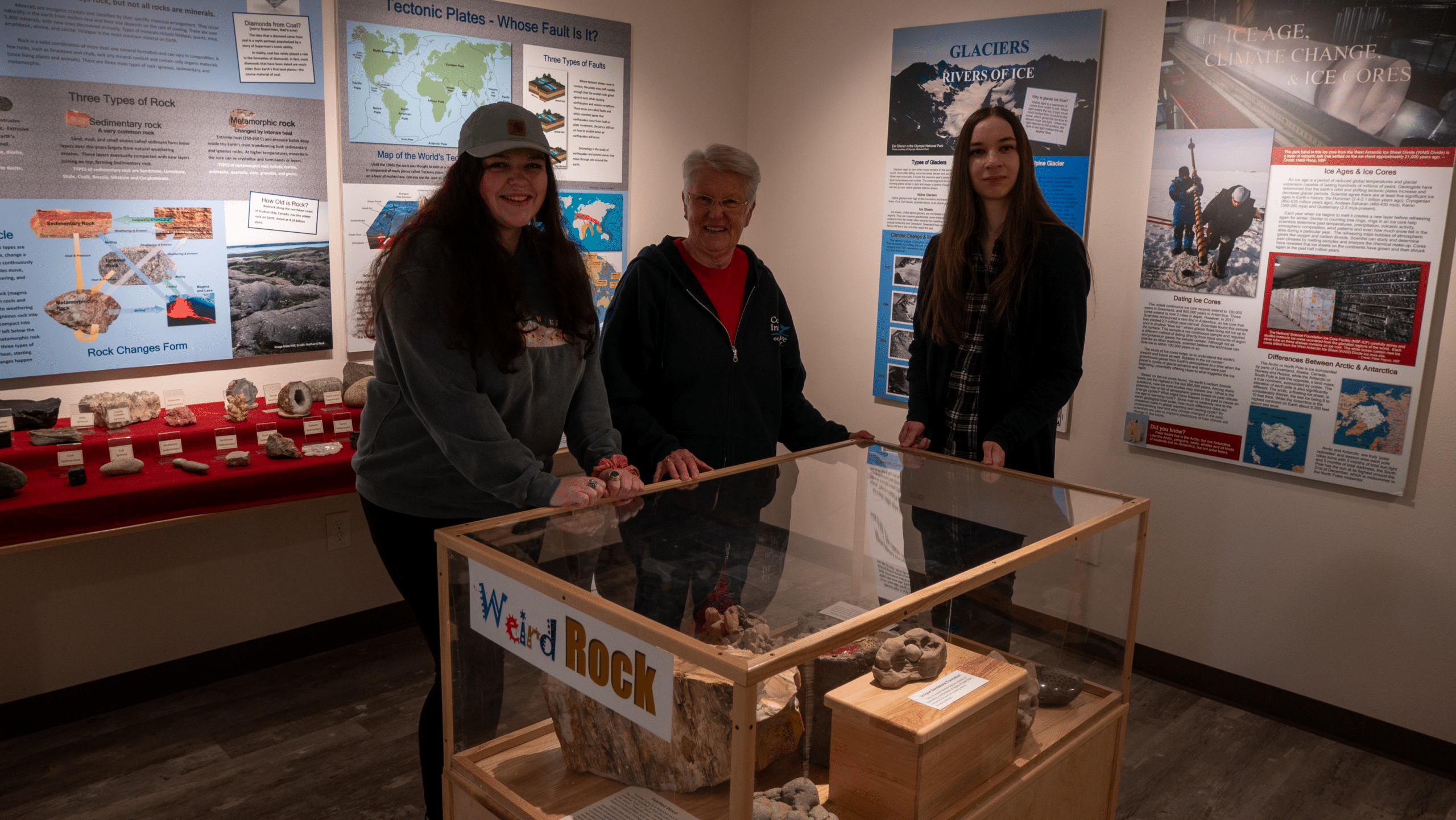 Just past Sally the Sea Otter, a looping video plays information about spawning Coho Salmon. The geology displays in the next room glitter with unique minerals like “fulgurite,” made from the lightning strike-like explosion of a transformer in sand. Interpretive displays and artistic renderings of the geological record tell stories about Washington’s ancient past, and local artists attempt to capture “King Tides and Winter Storms” in art displayed on the wall. Walking deeper into the Center, the walls are decorated with remnants of shore debris.