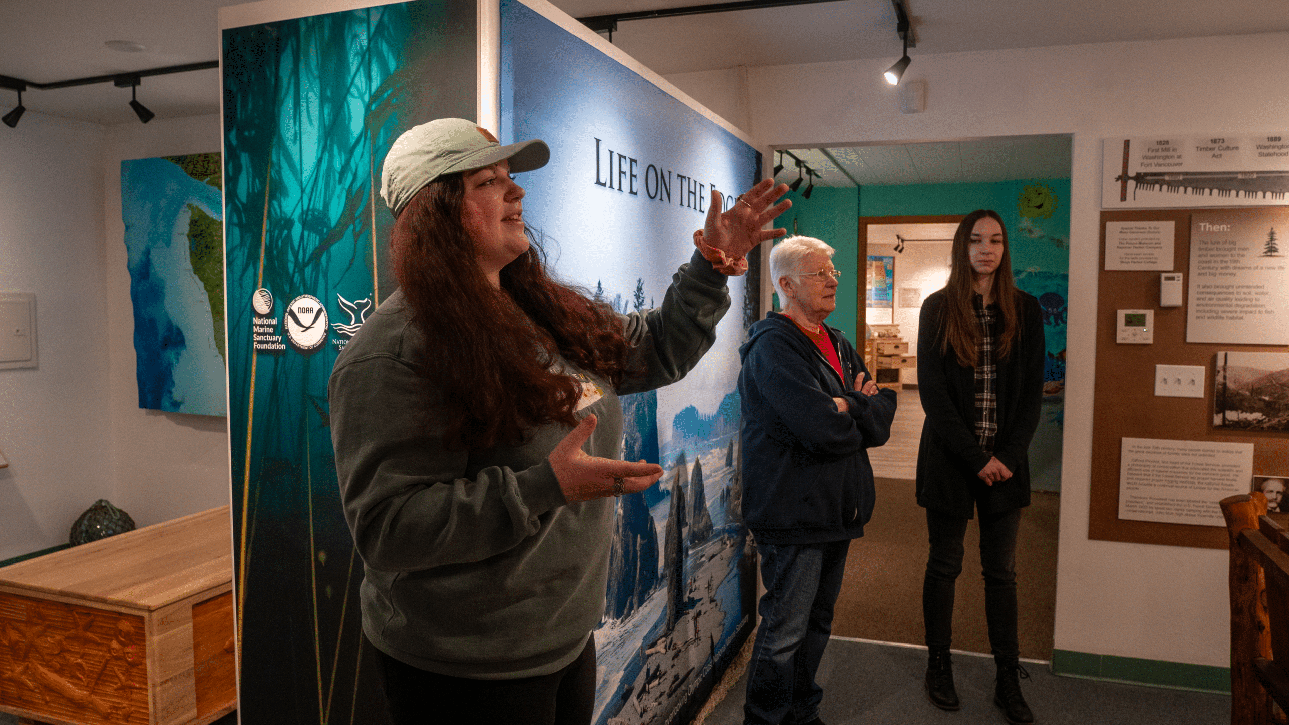 Continuing past the forest of taxidermy creatures, dioramas tell stories about Quinault Tribal fishing villages. Around the corner from the woven baskets are artifacts from ships wrecked on nearby beaches. The Center’s exhibits encourage guests to feel wonder for their community with interactive games like a bird identification quiz.