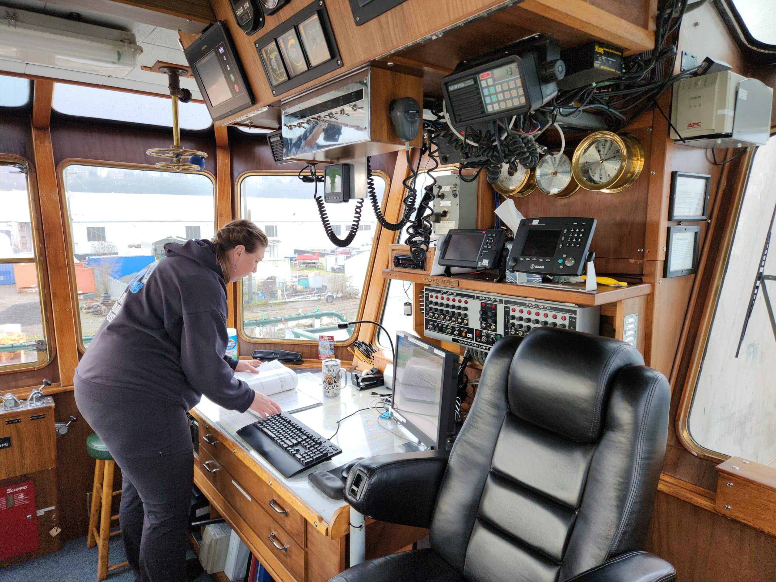 Her day begins at 6:00 am when she returns to work. Until noon, her “watch” is on, and she’s in charge of the ship. She makes her coffee and heads up to the pilothouse to check in with the prior watch and look over the work for the day.