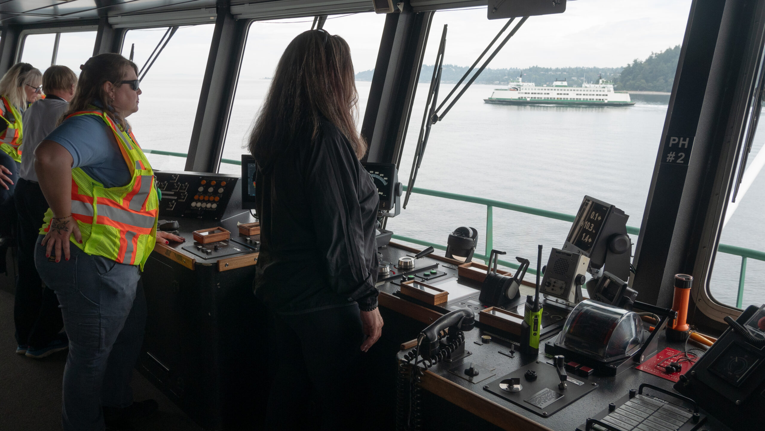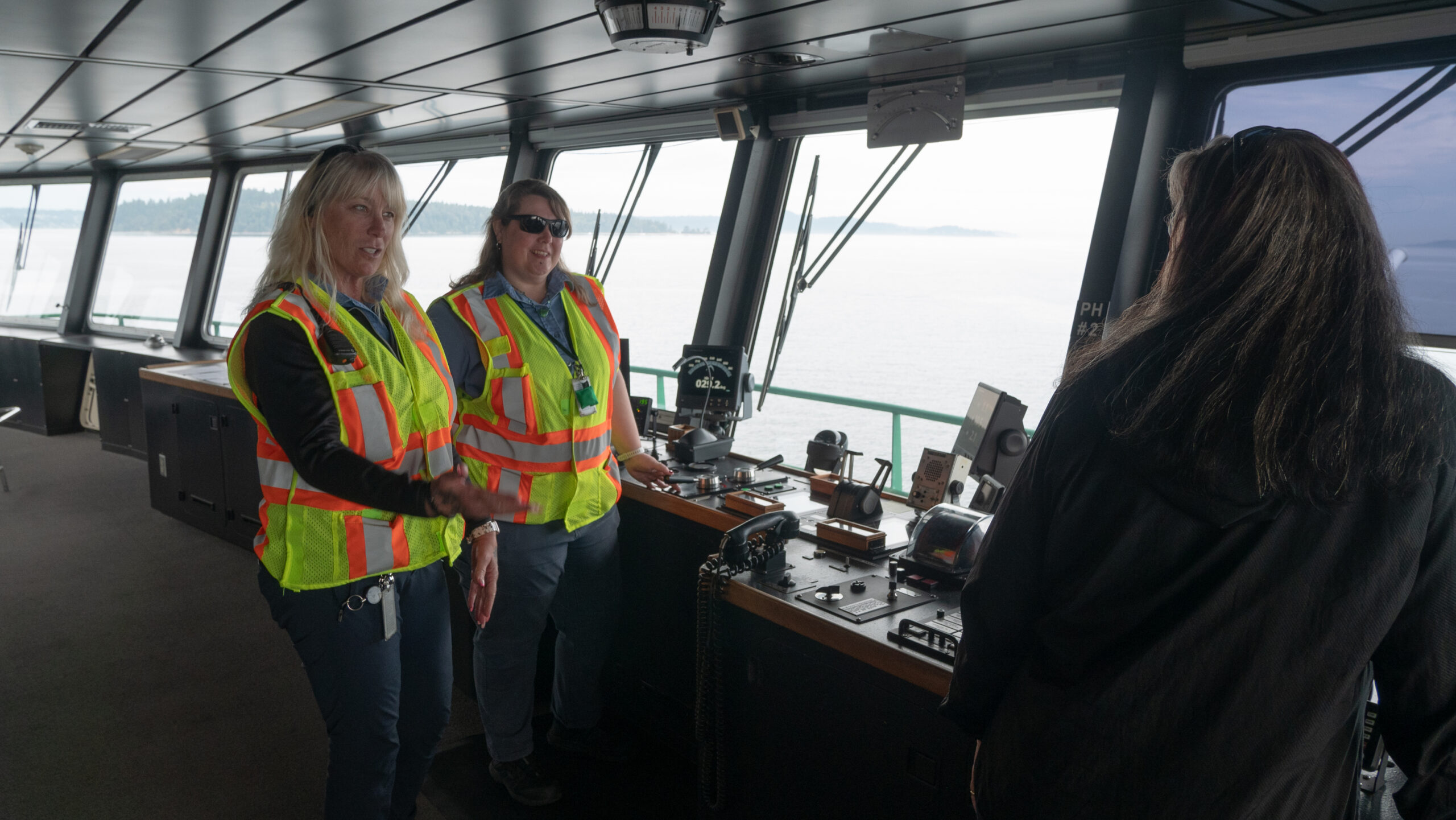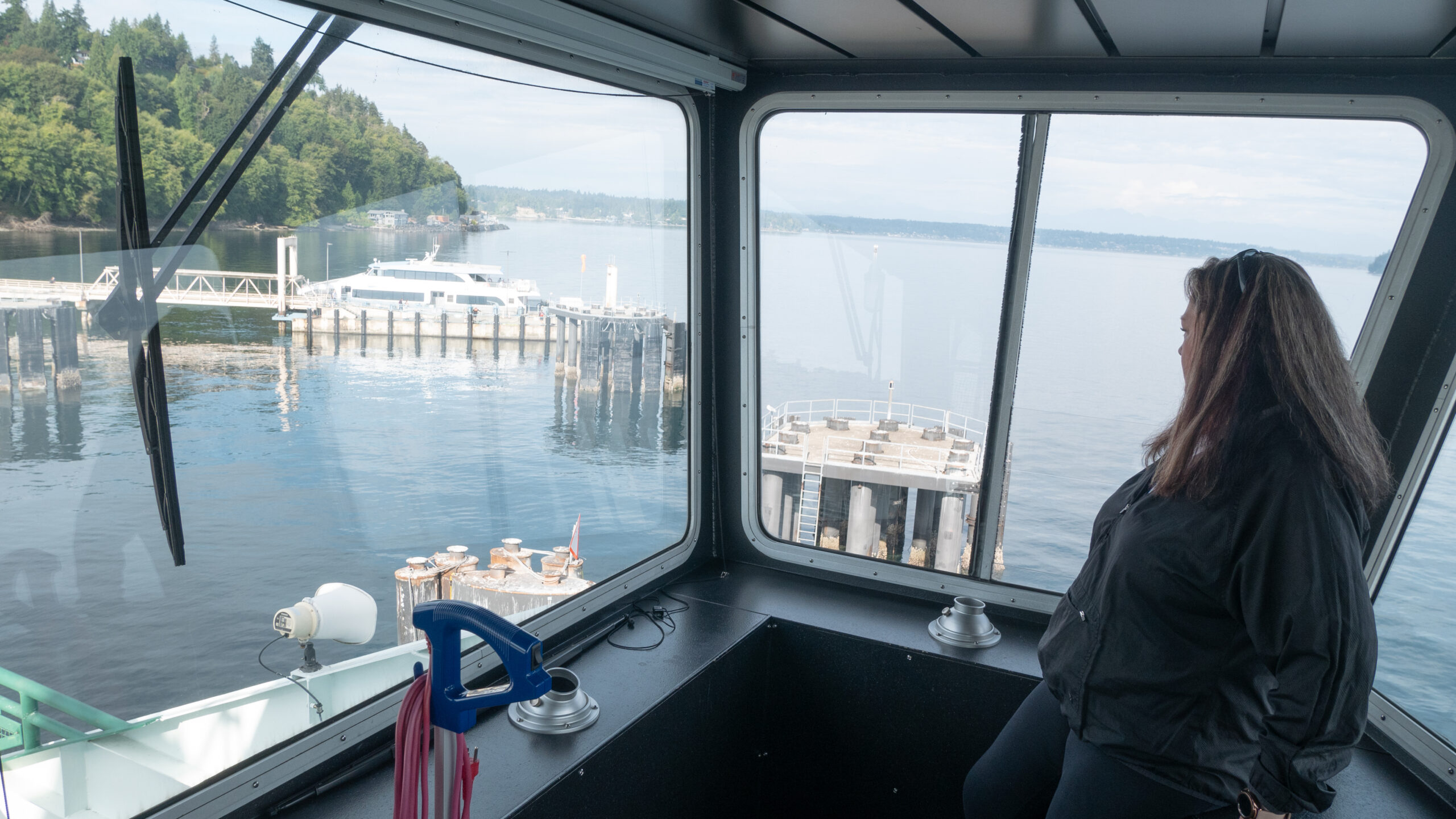 Michele Allen, first relief chief mate, stands at the helm of the ferry Salish. She guides her ship into dock and signals her team of crew members to change radio protocols as they begin guiding passengers on board the ferry. Once the vessel is loaded, Michele passes control of the vessel to the other pilothouse. As she steps away from the controls, the small handles that control the massive vessel start moving in mirror to the motions of the captain at the other end of the ship, and the ferry pulls away from the dock.