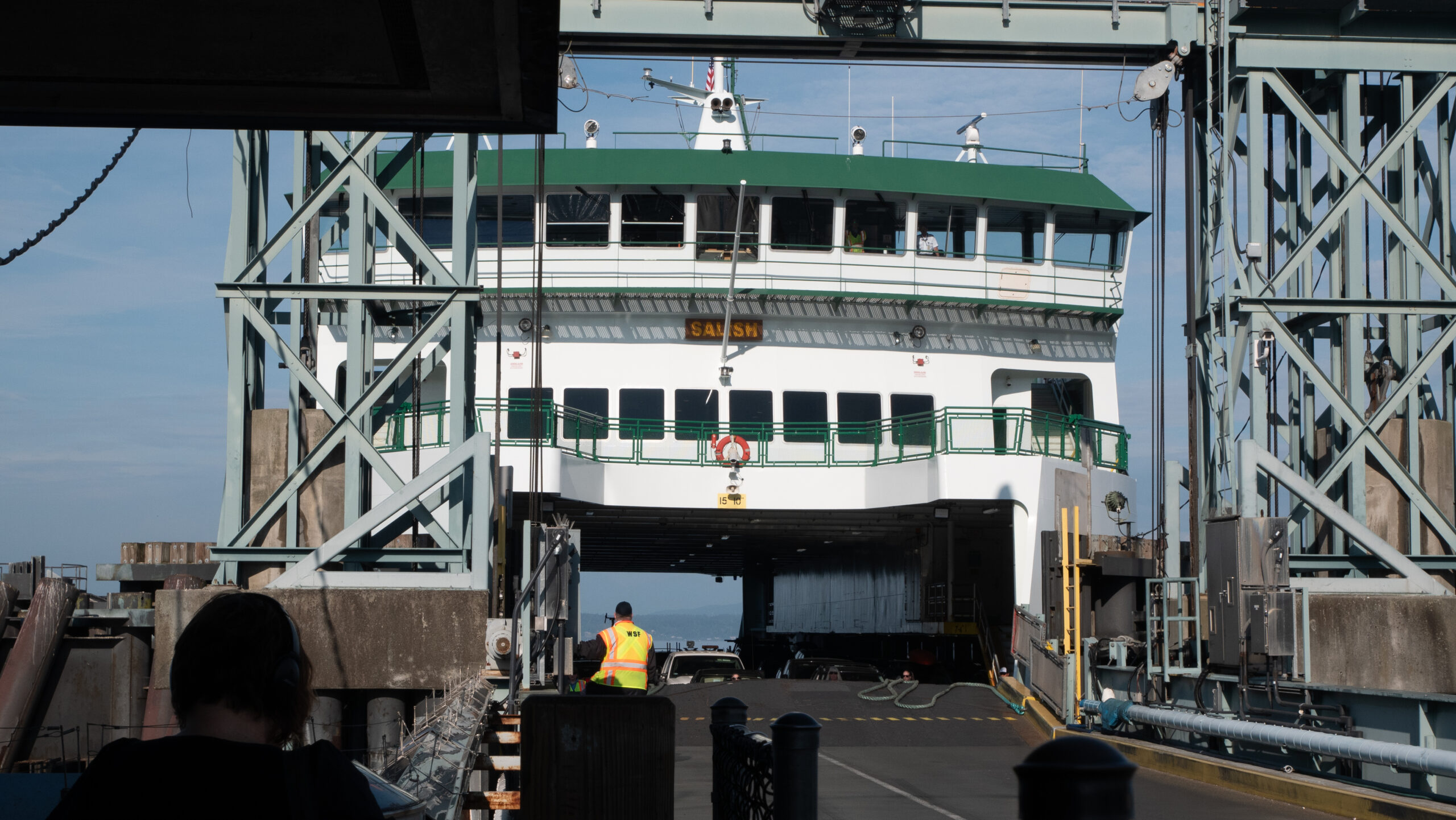 Today, Michele is piloting the ferry Salish between Fauntleroy and Vashon Island. It’s a “ghost boat” route, which is not publicly announced. It’s just one route in the Washington State ferry system which overall encompasses 10 routes, 21 vessels, and 18.7 million annual riders. The Fauntleroy/Vashon/Southworth route is particularly complicated due to its three ports. Most routes go from one terminal to another without turning, but the “Triangle Route” gets to make a turn at Vashon to continue the journey. “I love doing that. It’s so much fun,” Michele says.